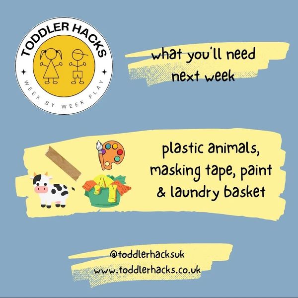 Next week you'll need some plastic animals, paint, masking/painters tape and a laundry basket (or any box big enough for your toddler to sit in!)
