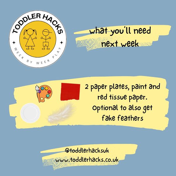 Next week, you'll need a couple of paper plates, paint and tissue paper. You could source some fake feathers but up to you!