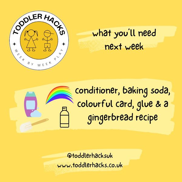 Next week you'll need (bear with me) conditioner, baking soda, coloured paper, and glue. And our activity will be making gingerbread so check out a recipe and buy those ingredients!