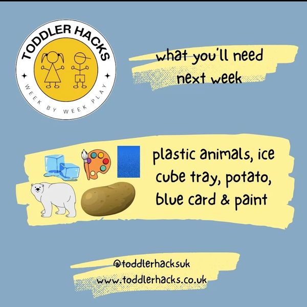 Bit of a random list for next week but trust us it's a good week! You'll need some plastic animals, an ice cube tray, a potato and some colourful card. And some paint, as always!